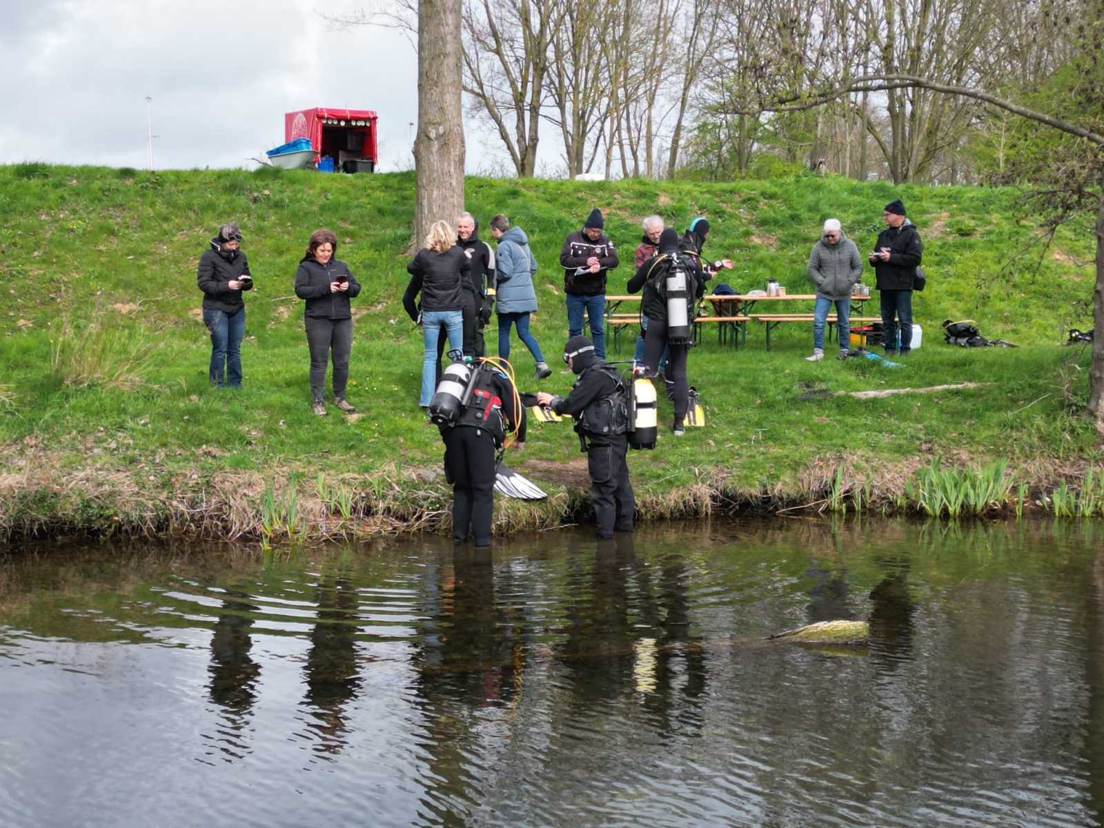 Na het omkleden trotseerden maar liefst zes fanatieke duikers het water, aangemoedigd door een groep van ongeveer zes toeschouwers langs de kant. De omstandigheden waren typisch voor de tijd van het jaar: een stevige wind, een watertemperatuur van zo’n 10 graden en een zicht van circa 5 meter. Geen tropische duik, maar juist dat maakt de paasduik zo bijzonder!