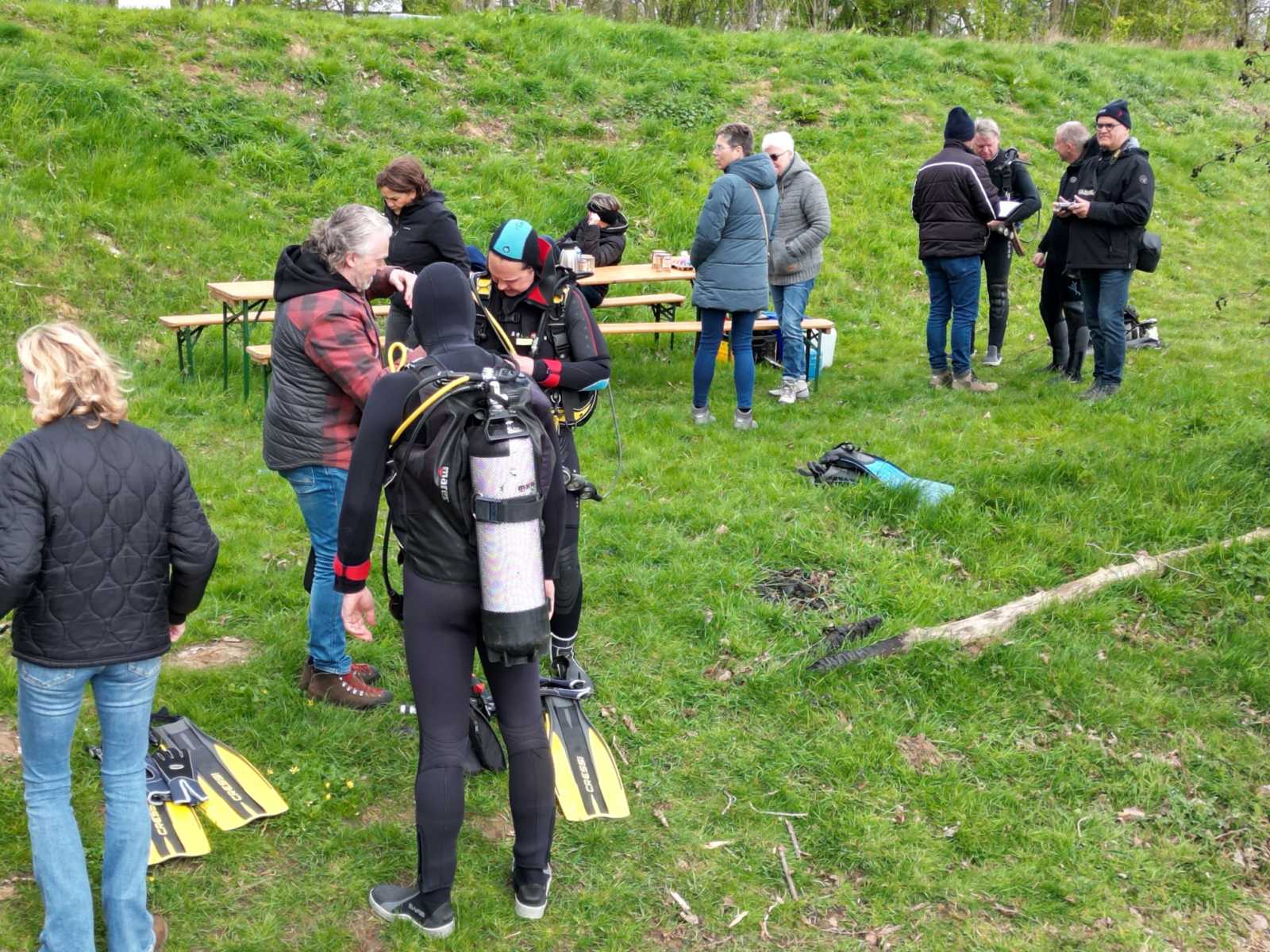 Na het omkleden trotseerden maar liefst zes fanatieke duikers het water, aangemoedigd door een groep van ongeveer zes toeschouwers langs de kant. De omstandigheden waren typisch voor de tijd van het jaar: een stevige wind, een watertemperatuur van zo’n 10 graden en een zicht van circa 5 meter. Geen tropische duik, maar juist dat maakt de paasduik zo bijzonder!