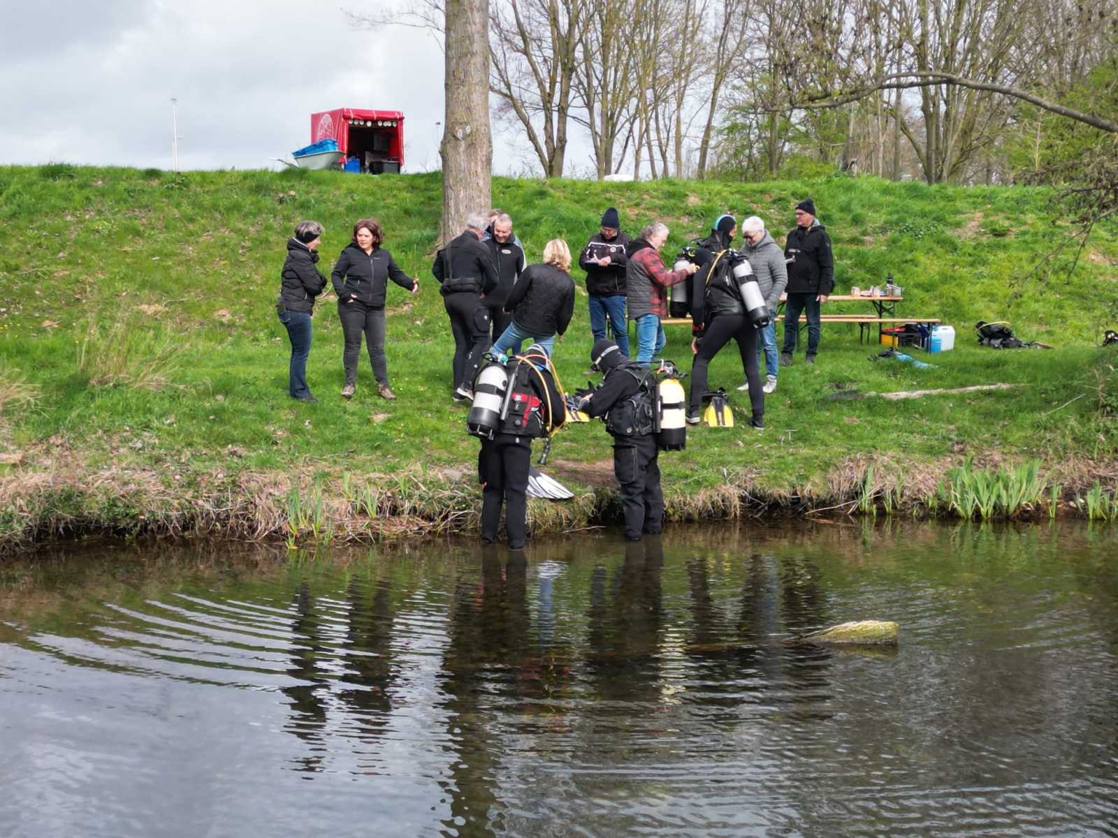 Na het omkleden trotseerden maar liefst zes fanatieke duikers het water, aangemoedigd door een groep van ongeveer zes toeschouwers langs de kant. De omstandigheden waren typisch voor de tijd van het jaar: een stevige wind, een watertemperatuur van zo’n 10 graden en een zicht van circa 5 meter. Geen tropische duik, maar juist dat maakt de paasduik zo bijzonder!